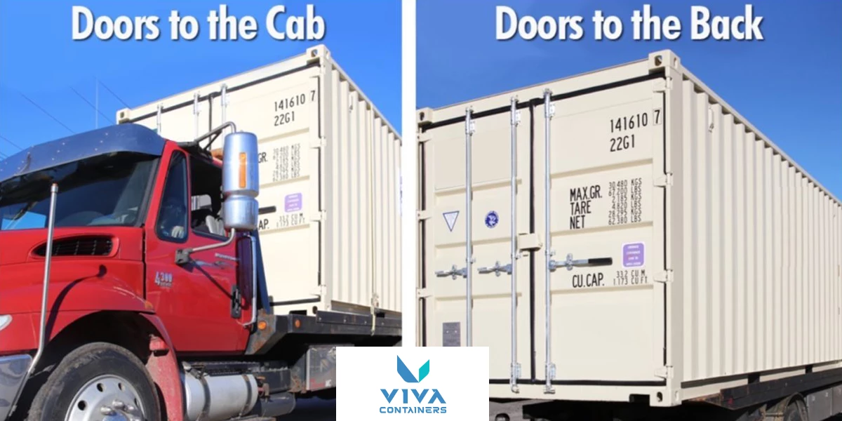 In this case, the doors will face toward the rear end of the truck. Essentially, they'll be the last thing to leave the trailer during the delivery process. This option might be a perfect fit if you're planning to snug your container up against a structure like a fence, barn, or similar.