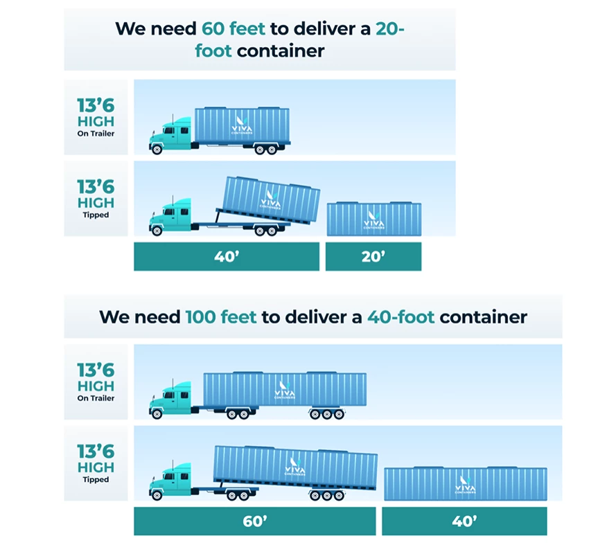 - Length Restrictions: For a 20ft container delivery our trucks need a minimum of 60ft in a straight line. For a 40ft container delivery, our trucks need a minimum of 100ft in a straight line.